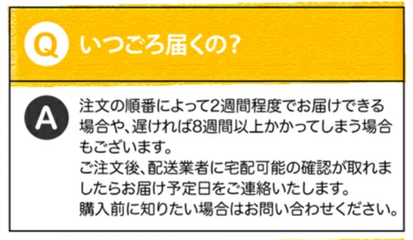 納期については、注文確定した段階でおおよその、『お届け目安』の連絡がメールで届きます。